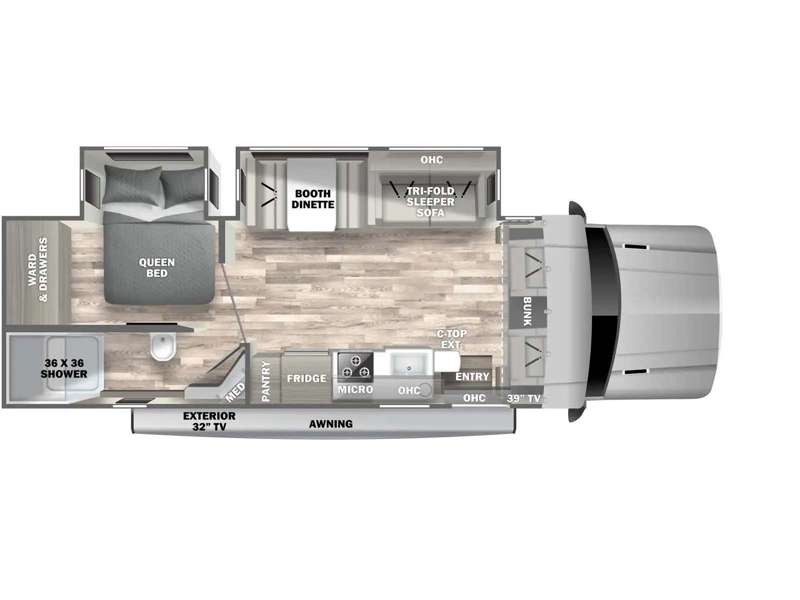 - Front Cab-Over Bunk Area with Mattress (50” x 80”) and Privacy Curtain